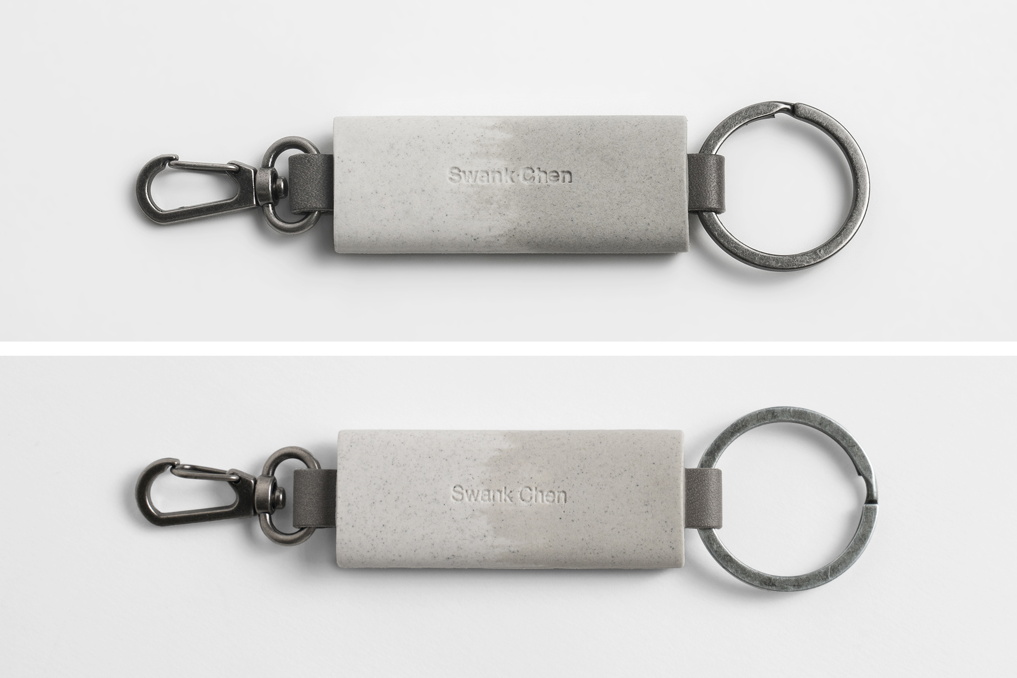 精選三款軟水泥經典色的工藝系列產品:軟水泥杯墊、軟水泥鑰匙圈2、軟水泥名片夾2,以解析度1000 DPI的雷射雕刻技術刻上英文姓名、表情符號等。