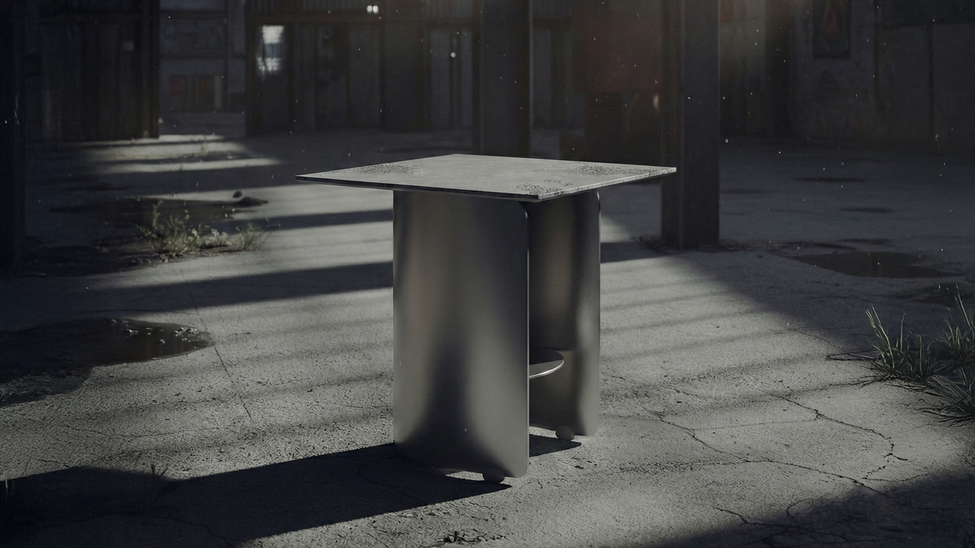 桌角採用不銹鋼材質,霧面噴砂處理,透過折彎技術呈現 Ω 式曲線,成為堅毅卻流動的結構語言,闡述金屬力量與柔和美學的平衡。這樣的矛盾與和諧,讓「OMEGA 軟水泥邊桌」既是家具,更是一種生活哲學。